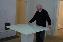 Après l’abandon de la toile et du châssis (1980), il recourt aux matériaux industriels pour les rapports spécifiques qu’ils entretiennent avec le blanc. Dès 1989, le travail de René Guiffrey s’applique désormais à l’utilisation de nouveaux médias comme le verre et l’eau. C’est la commande d’œuvres monumentales qui lui permet d’accéder aux techniques industrielles.